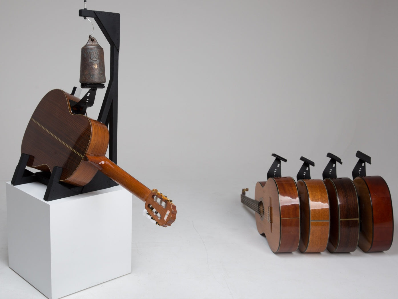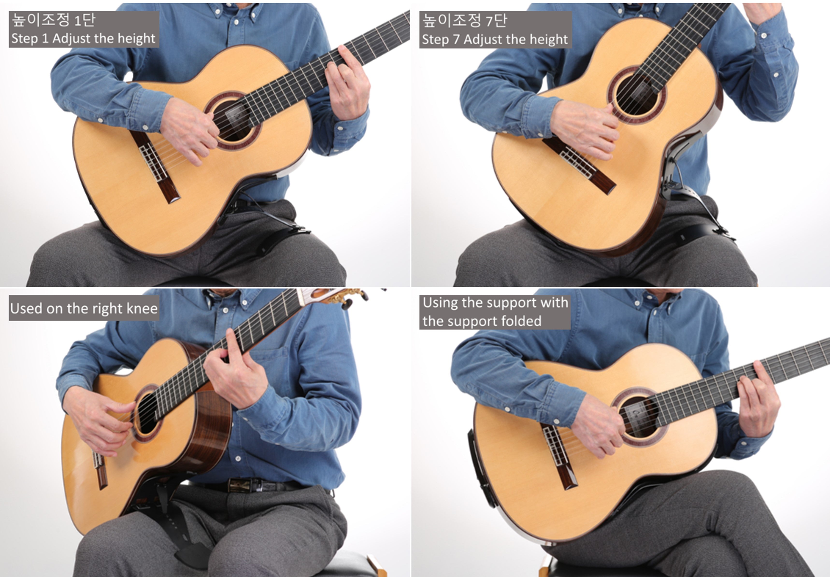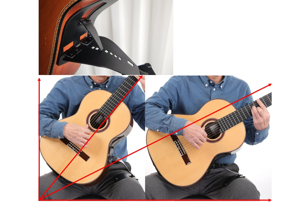 The angle of the guitar can be adjusted by the angle adjuster into the 1st to 7th hole to find a suitable position for the user; 1st hole to the lowest and 7th hole to the highest angle.